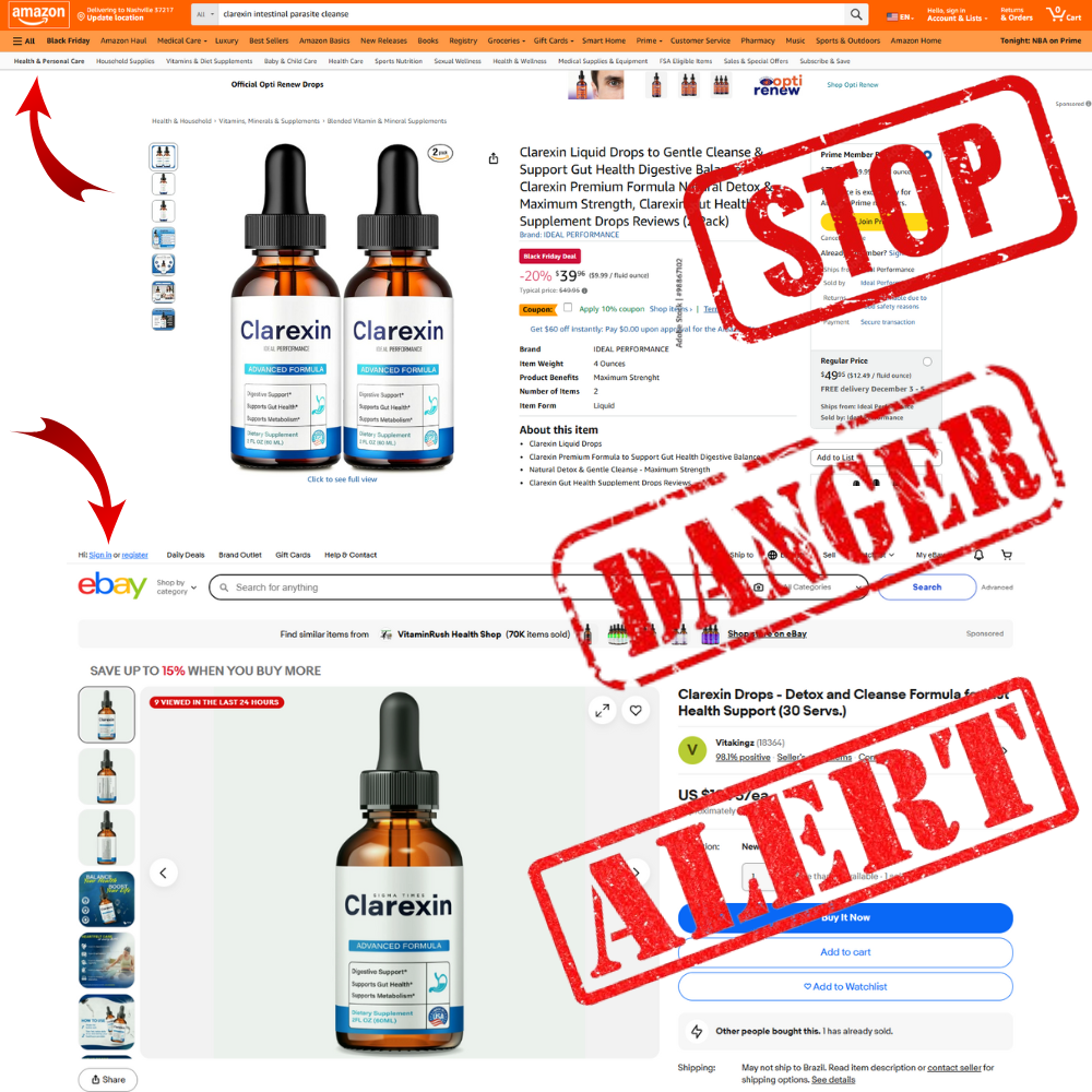 We do not recommend buying Clarexin Parasite Cleanse on Amazon, Walmart, or eBay, as all of them are counterfeit, with completely different ingredients, and this can be very dangerous for you.